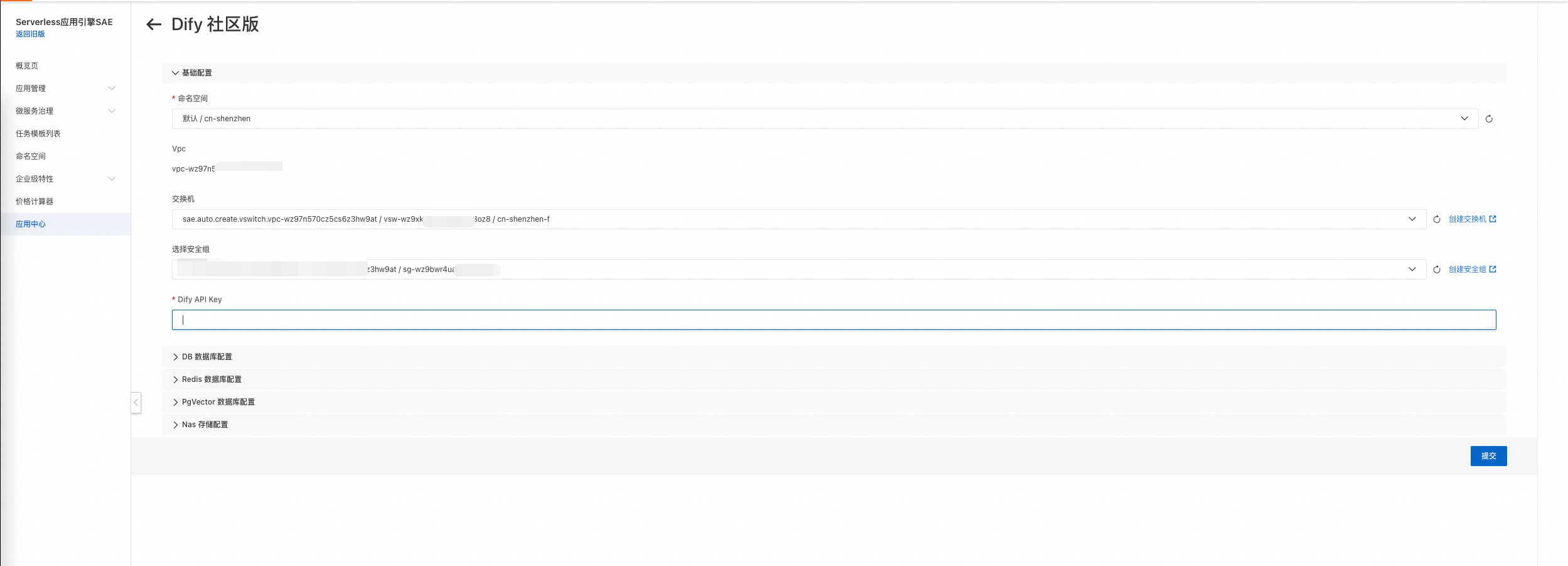 SAE 应用中心为用户提供了 Dify 应用模板,您只需要在控制台填写表单,我们会为您自动创建并运行部署流水线,将 Dify 一键部署至 SAE。