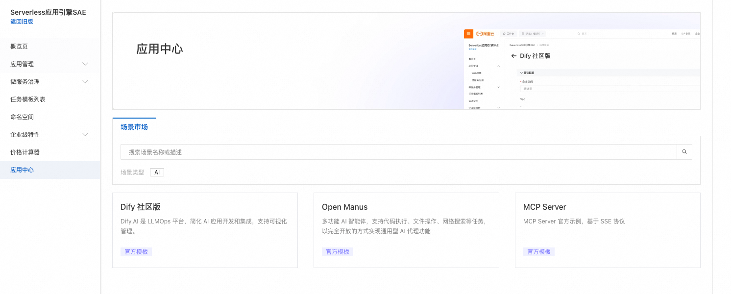 第一步:在 SAE 应用中心选择 Dify 社区版