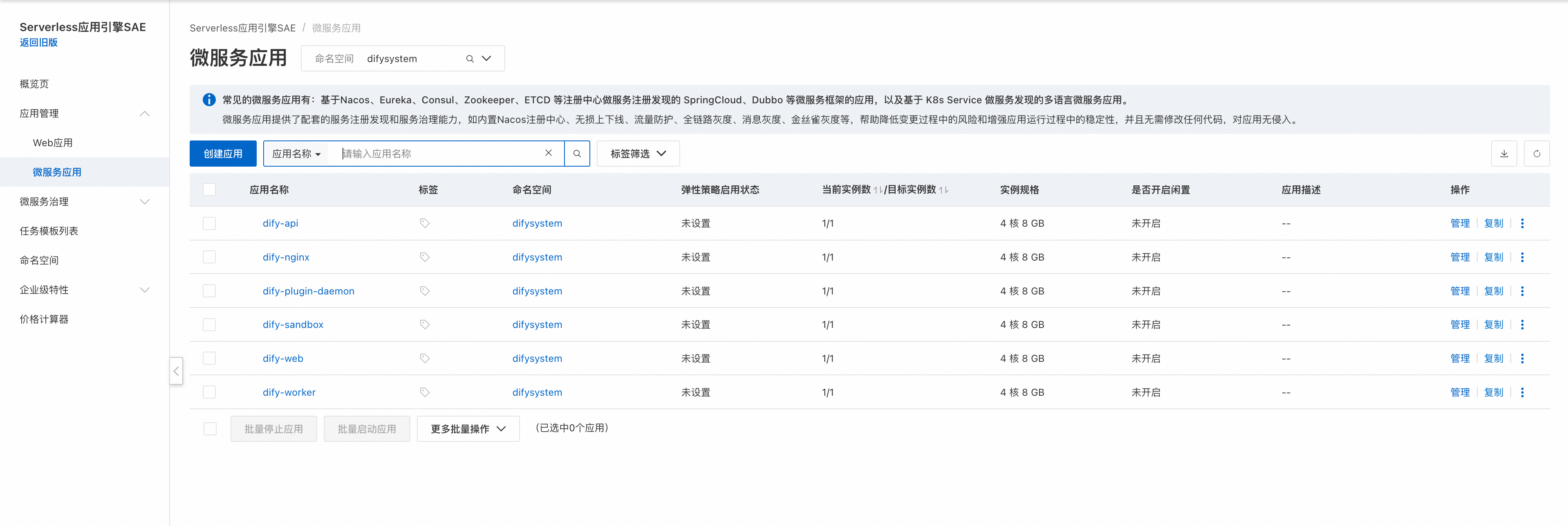 登录 SAE 控制台,可以看到已创建的 Dify 应用组件。