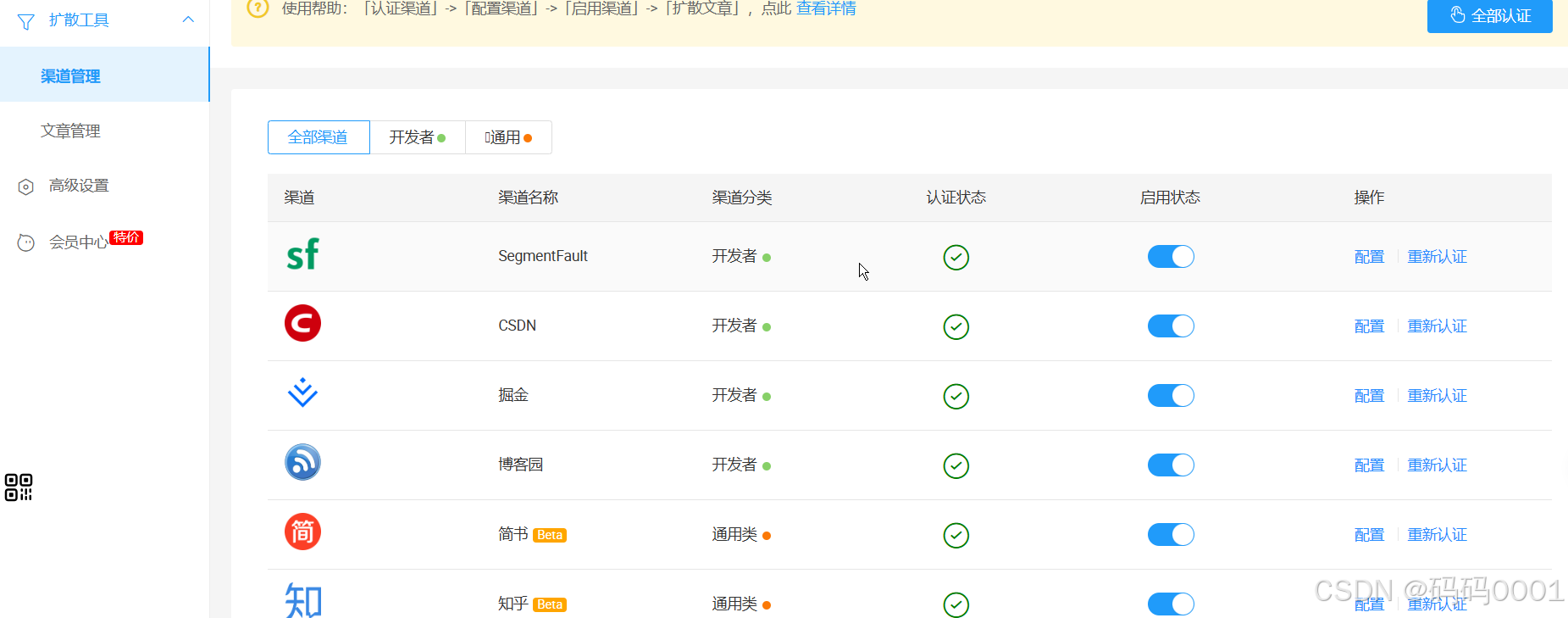 这里需要先登录一下自己各个平台的账号,确保没有失效,登陆成功后点击认证,再进行配置。