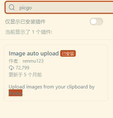 (需要魔法)首先插件市场搜索picgo会出现Image auto upload,这个就是PicGo安装此插件并启用即可,无需额外配置,即装即用