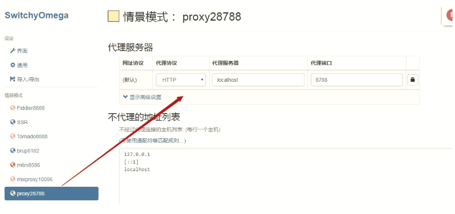 1.将chrome浏览器代理服务器设置为127.0.0.1:8788,推荐使用SwitchyOmega插件.