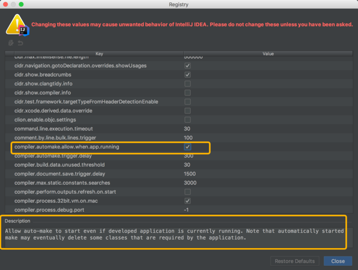 接下来我们利用快捷键:Command + Shift + Alt + / 来调出Registry窗口,然后勾选其中的编译器自动编译选项,如下图所示: