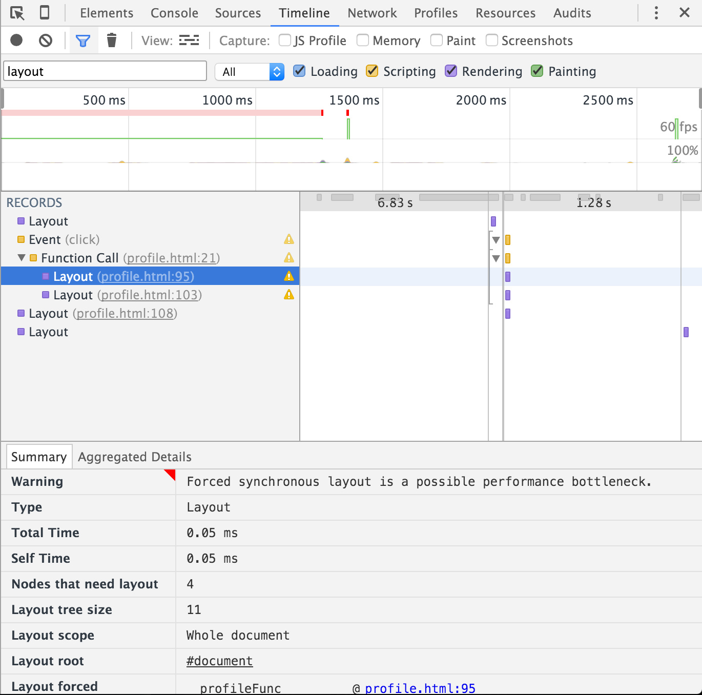 上面的例子中,代码首先修改了一个元素的样式,接下来读取另一个元素的clientHeight属性,由于之前的修改导致当前DOM被标记为脏,为了保证能准确的获取这个属性,浏览器会进行一次layout(我们发现chrome的开发者工具良心的提示了我们这个性能问题)。