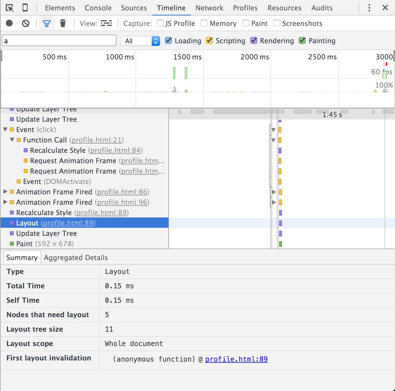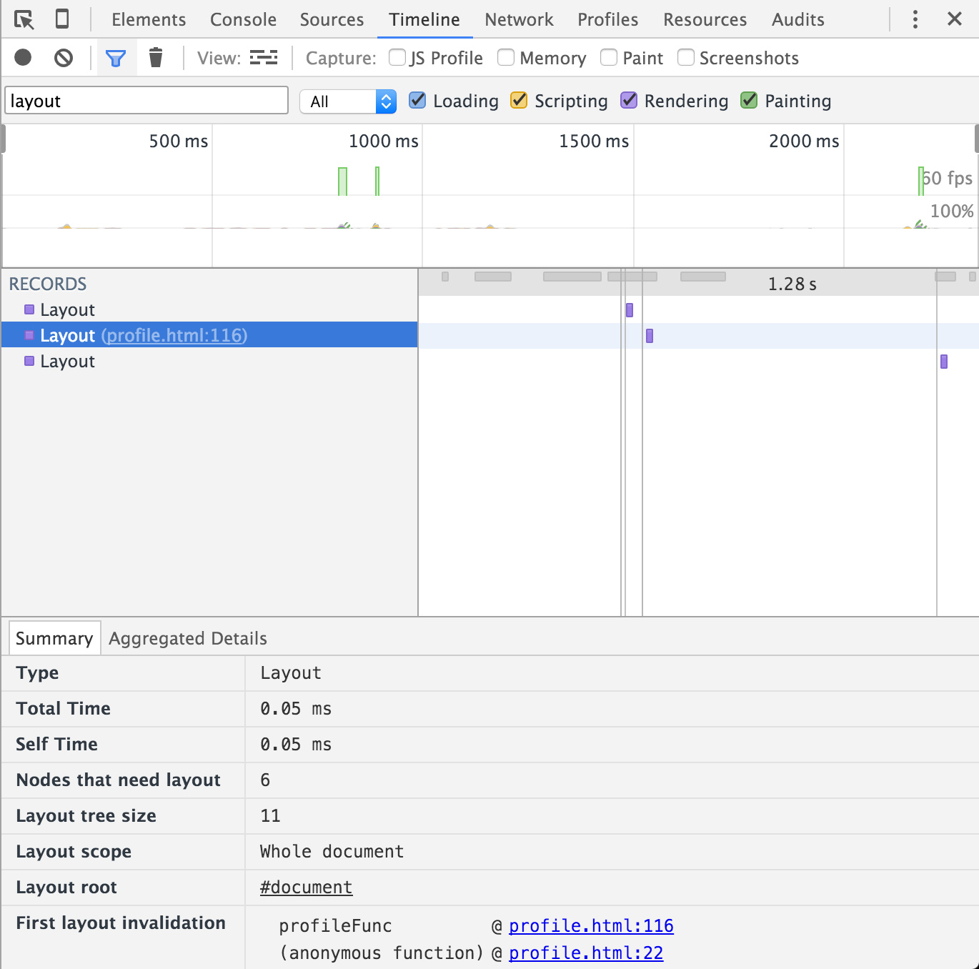 clientHeight,这个属性是需要计算得到的,于是就会触发浏览器的一次layout。我们来利用chrome(v47.0)的开发者工具看下(截图中的timeline record已经经过筛选,仅显示layout):