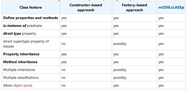 当构建一个应用程序时,我们可以使用这两种方法创建类,这取决于应用程序的需求 。mODELcLASSjs是一个比较成熟的库用来实现工厂方法,它有许多优点。(基于构造的方法有一定的性能优势)