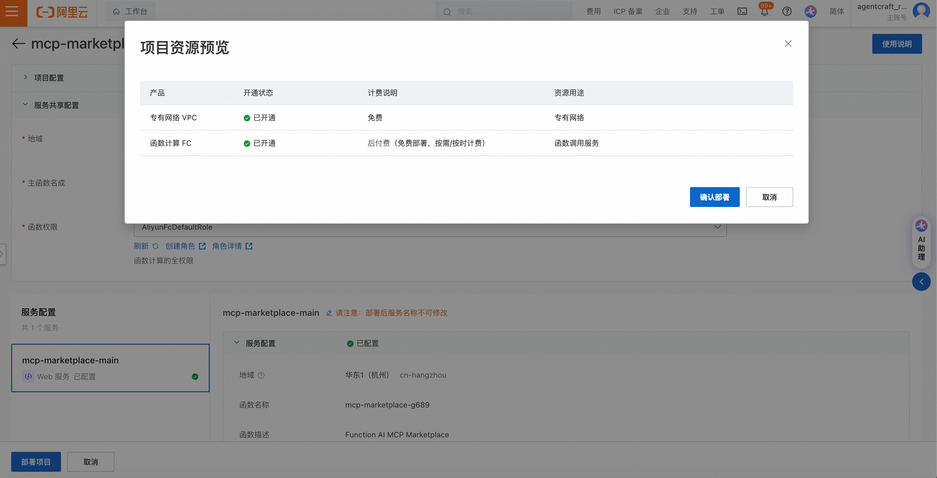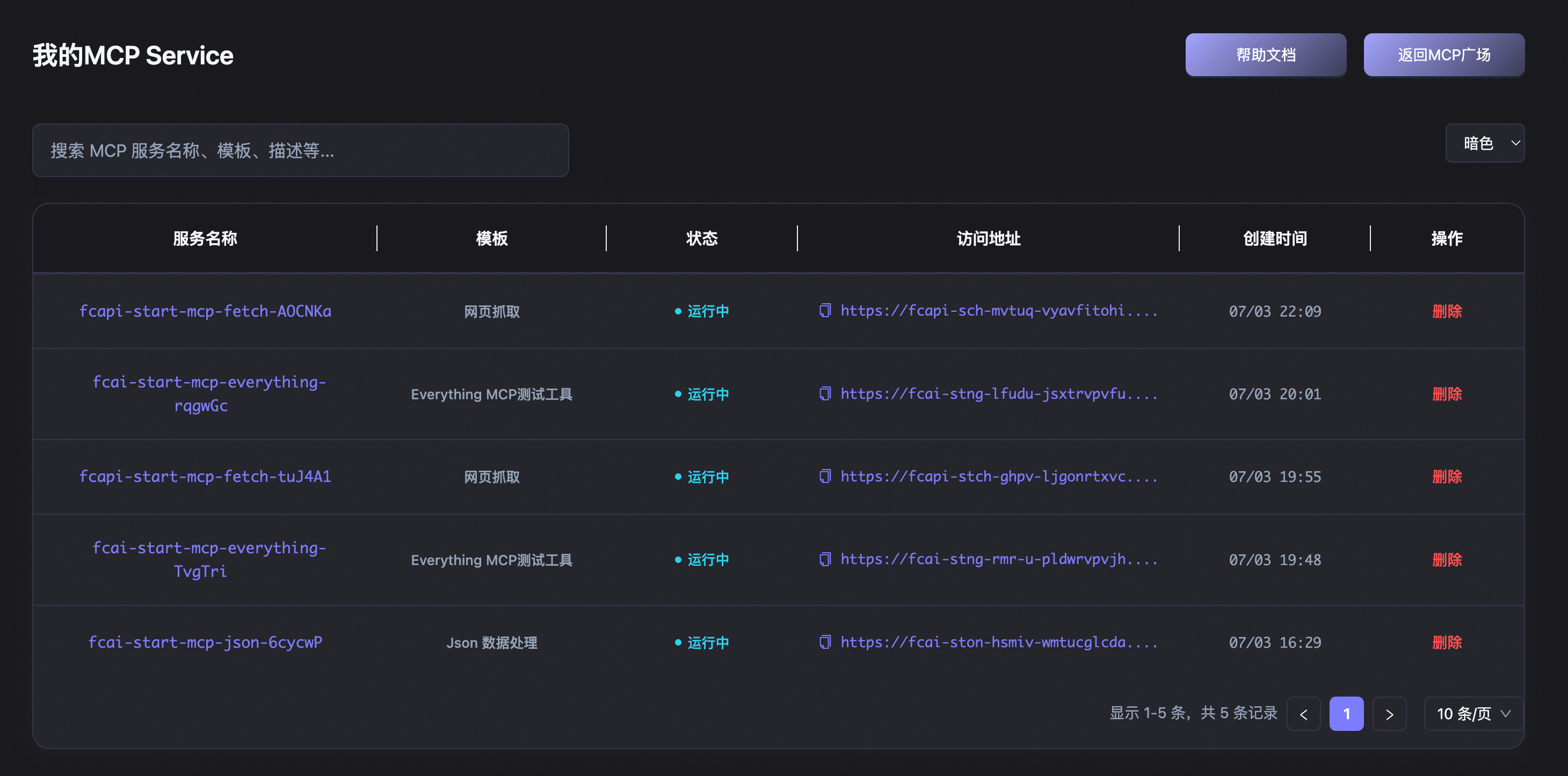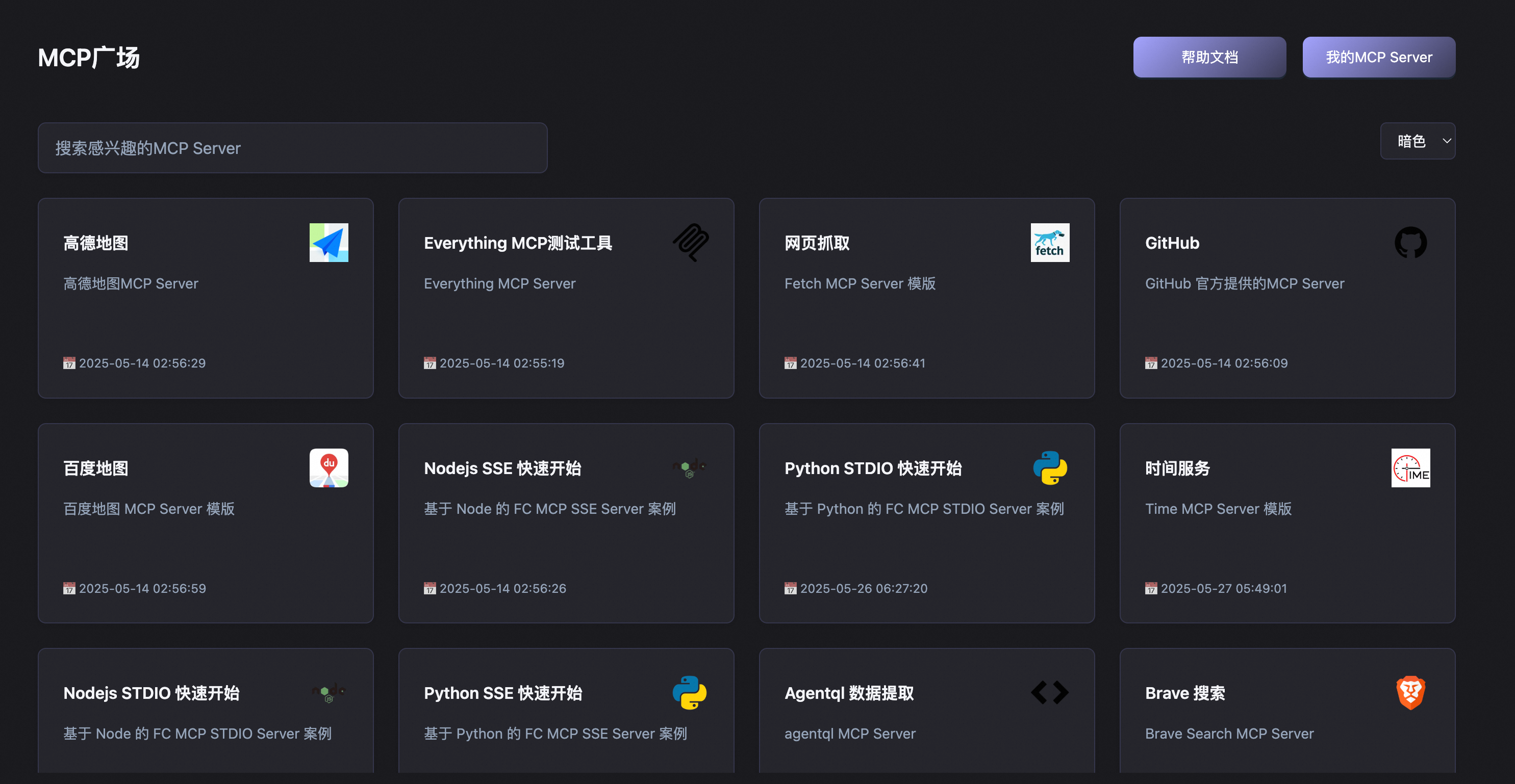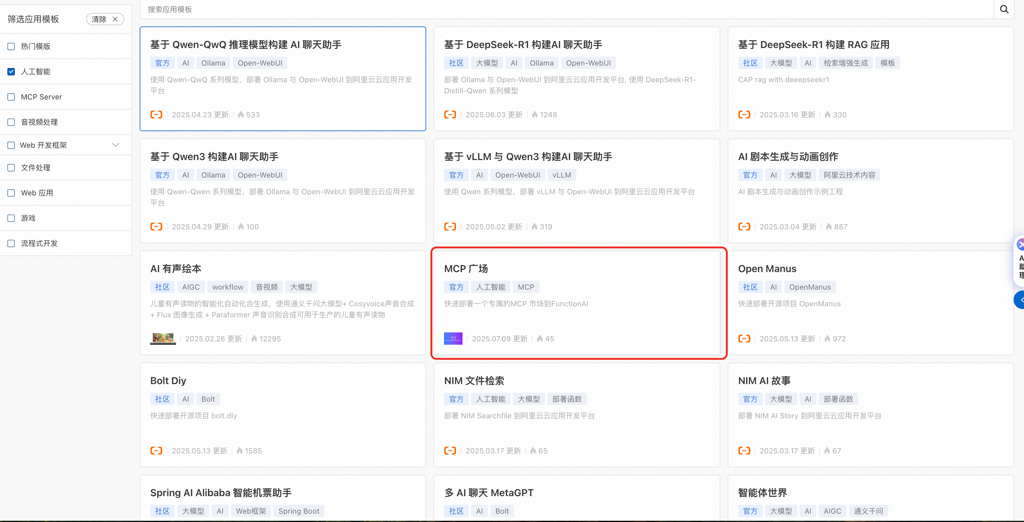 以下将简单介绍通过 Function AI 内置的 MCP 服务模板快速体验部署。自定义 MCP 的生产发布流程请点击查看:开发 MCP 服务详细介绍