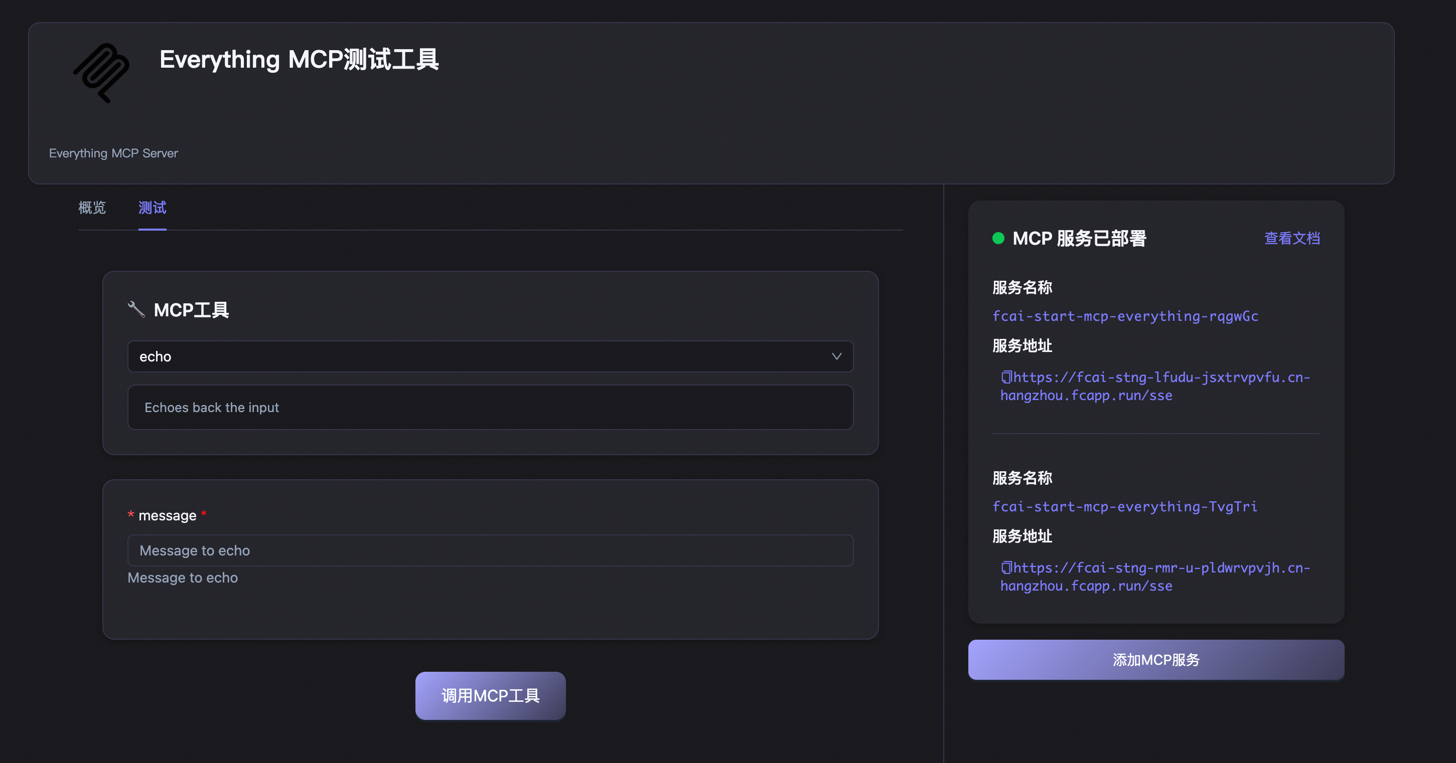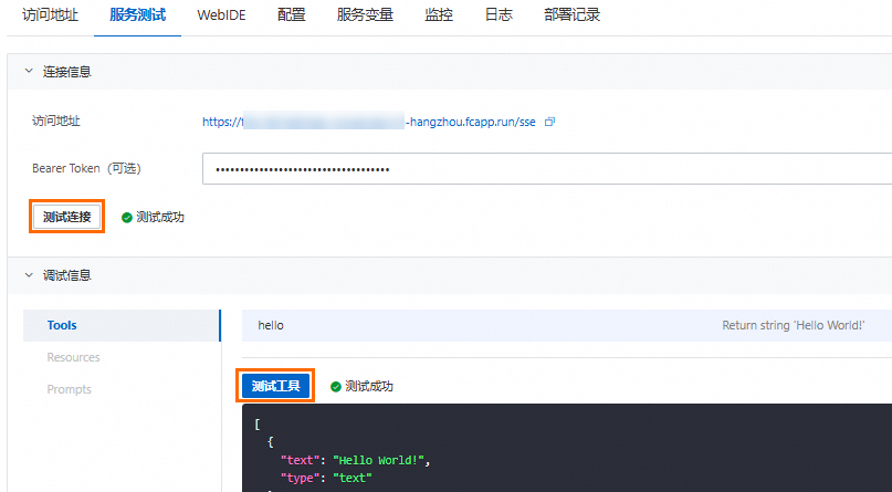 当 MCP 服务部署完成后,平台会生成一个 SSE 连接地址,用于 MCP 服务连接测试。您可以通过 Function AI 控制台进行测试,或使用官方的 Inspector 进行本地测试。