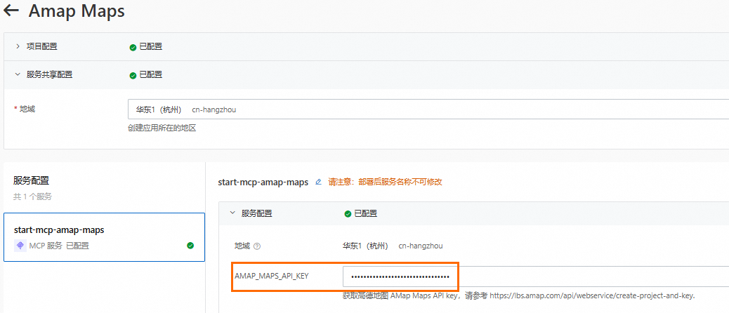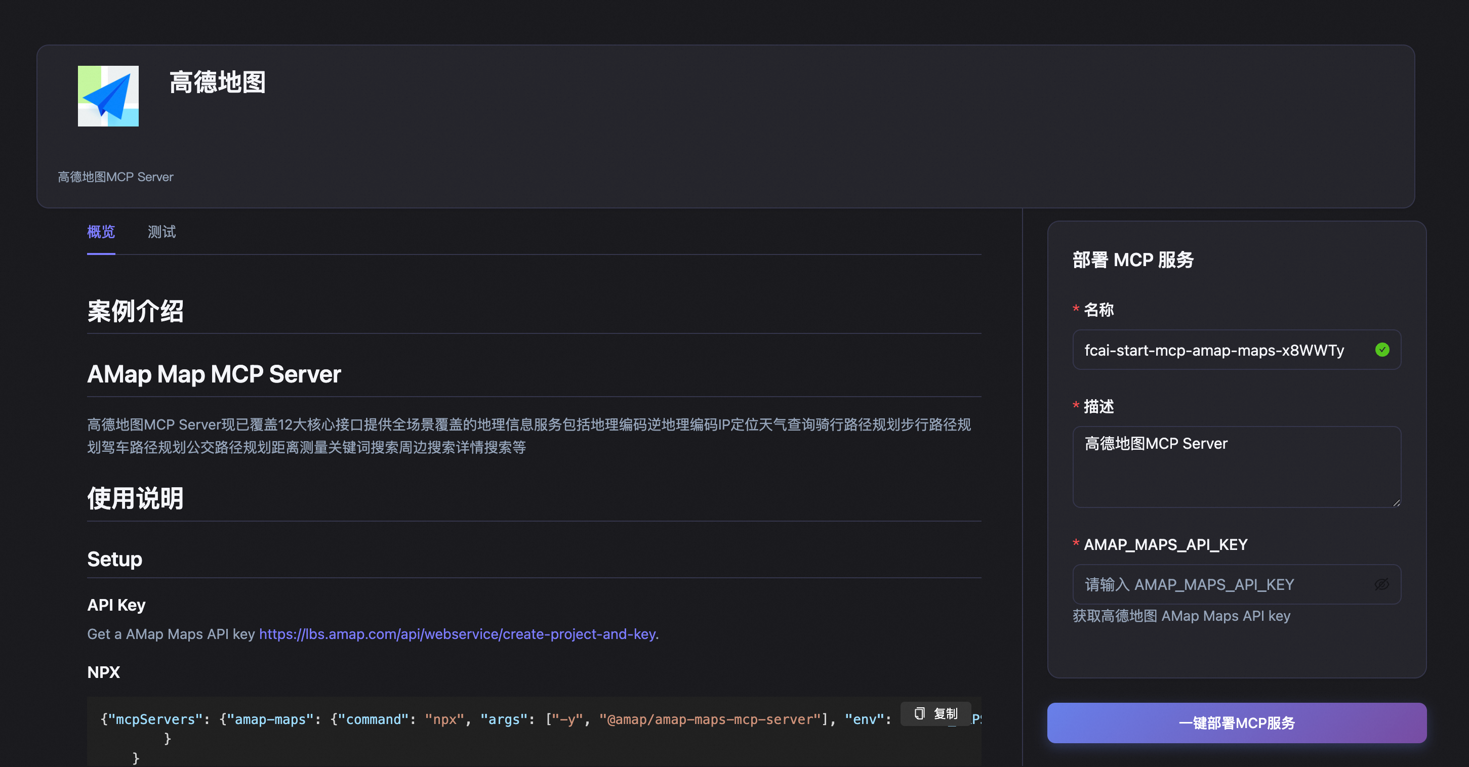 - 在模板详情页面,单击立即部署,进入服务配置页面,填写从高德开放平台获取的 API-KEY,然后单击部署项目。