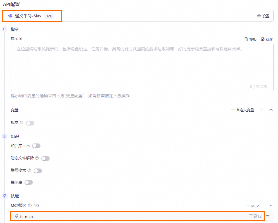 本位以选择 通义千问-Max 模型为例。您可以添加多个 MCP 服务,包括阿里云百炼预置的 MCP 服务和您自定义的 MCP 服务。