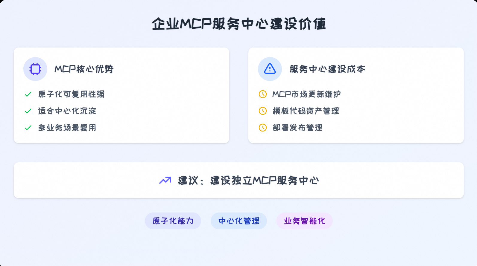 MCP 本身是属于原子化可复用性强的工具能力,因此非常适合中心化的生产和沉淀,因为可以给很多场景很多部分共同复用来建设各自业务的智能化体系。所以,对于企业而言,非常适合拥有一个独立的 MCP 服务中心,然而建设这个独立 MCP 的服务中心需要额外的成本, 需要提供 MCP 市场的更新,管理 MCP 模版代码资产,以及部署发布等。