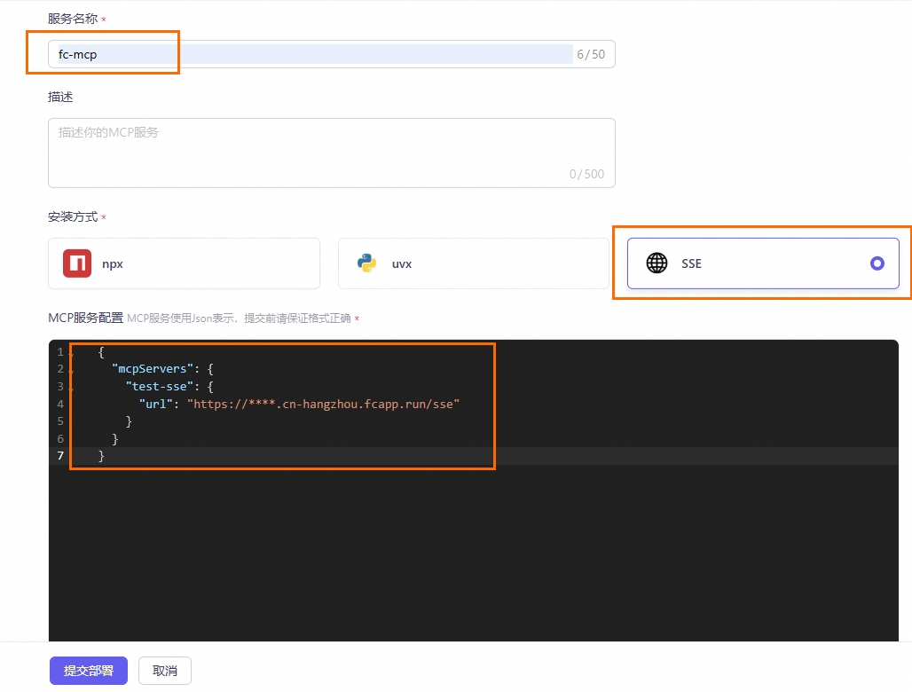 在创建 MCP 服务 页面,设置服务名称,选择安装方式为 SSE,填写服务配置,然后单击提交部署。