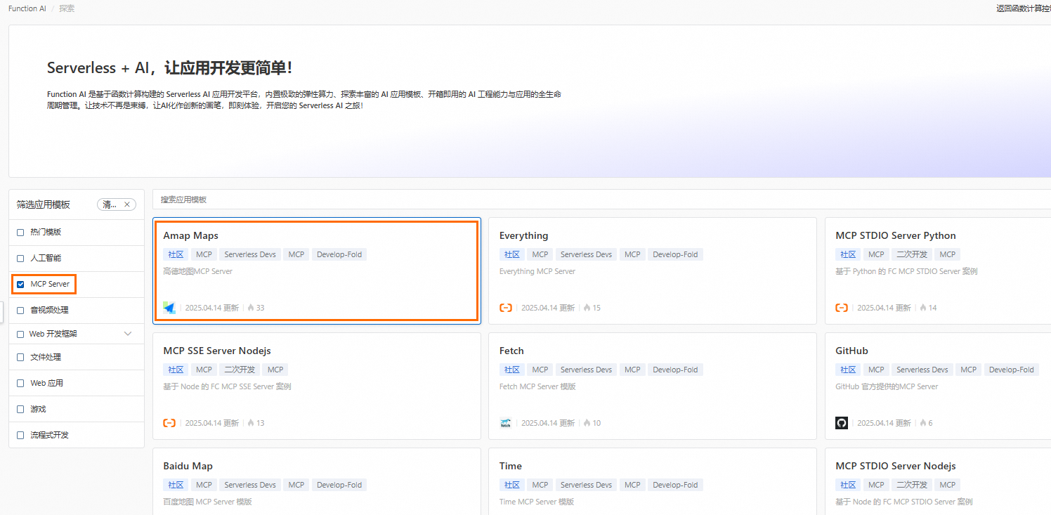 - 登录 Function AI 控制台,在探索页面,勾选MCP Server模板分类,选择任意一个 MCP 模板,单击模板所在卡片。本文以 Amap Maps为例。