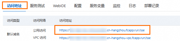 - 登录 Function AI 控制台,找到上一步创建的 MCP 服务,在项目详情页面,选择访问地址页签,获取公网访问地址用于后期测试。