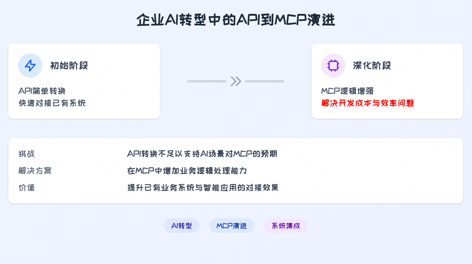 - 很多企业进行 AI 转型,对于存量的系统也是优先尝试 API 到 MCP 的转化,使得已有业务系统可以跟智能体或者智能应用完成有效对接。然而,随着 AI 的深入使用,我们也发现,单纯靠针对原子 API 转换 MCP 不能完全适应真实的业务场景,存在不灵活的问题,不可避免的需要构建一些新的自定义 MCP,此时企业需要面对构建自定义 MCP 的方方面面问题,涉及 MCP 的开发,调试,部署,发布等一系列流程。