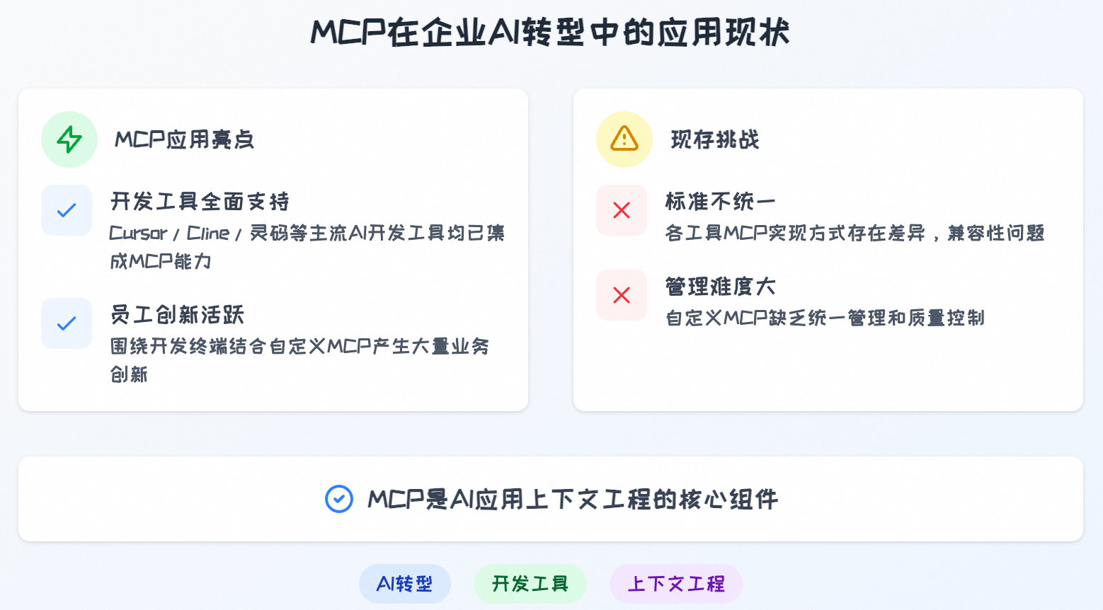 MCP 作为 AI 应用上下文工程中最重要的组成部分,现在已经被越来越广泛的应用于企业 AI 转型的生产实践中,比如企业开发人员会使用 Cursor,Cline,灵码等 AI 开发工具,而这些工具无一例外都支持了 MCP,然后企业内部员工开始围绕这些开发终端结合自定义 MCP 做了非常多的有意义的创新,然而这里面也存在一些问题。