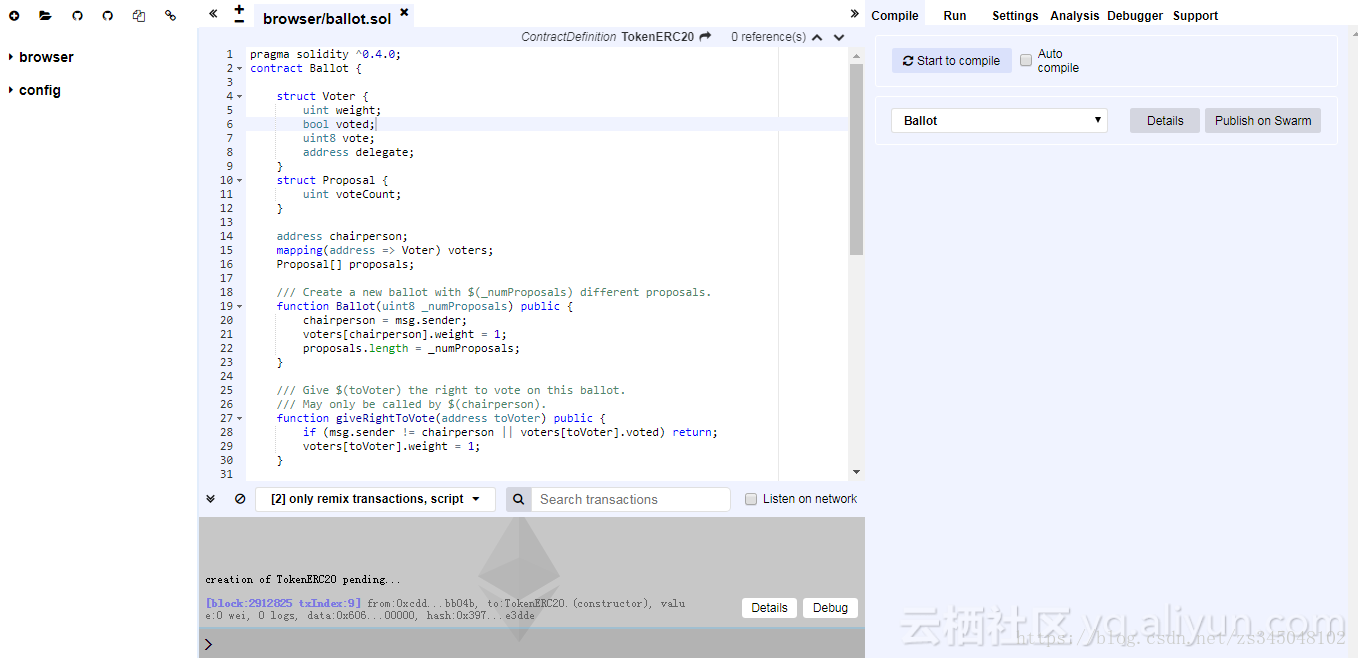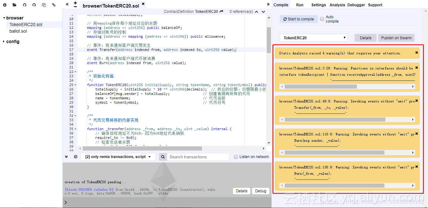 复制完成后,IDE的左边会自动校验你的合约的编写是否准确,有错误会提示,警告可以忽略。