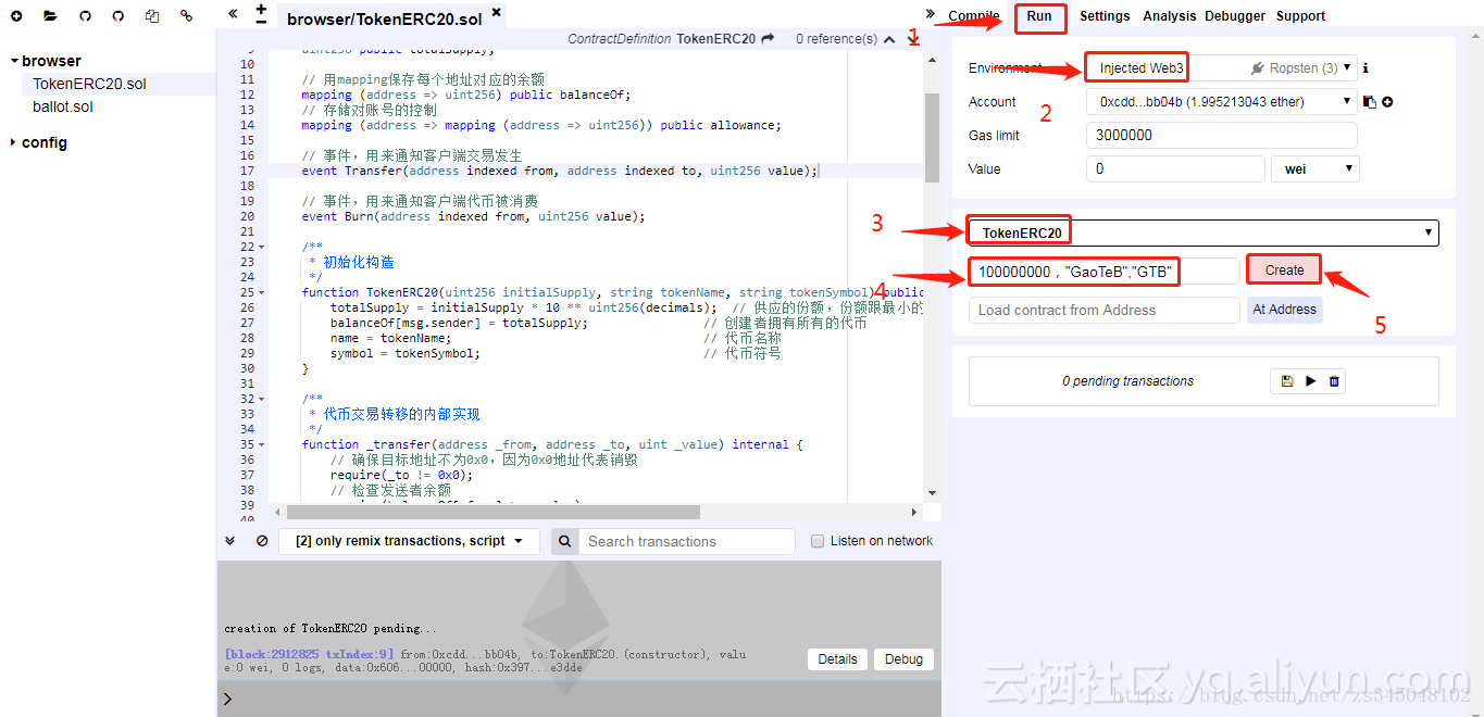 准备工作终于做完了,现在我们开始部署代币合约,这时候点击IDE右侧横栏中的run,按照1到3确认信息,并在4中编写你要发行的代币的信息,依次是100000000,"GaoTeB","GTB"(发行总量,发行币全称,发行币简称),4步确认不误后点击create按钮发布代币合约带测试链中。(我操作的时候,图中5的按钮变成了deploy)
