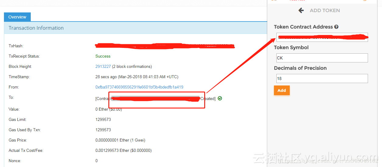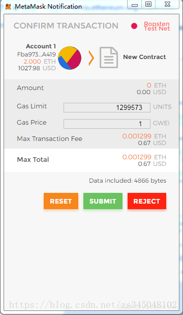 点击后,会弹出对话框:(这里是测试链,所以可以不用关注手续费的问题,但是在正式链上,一定要关注一下GasPrice,如果手续费过低没有旷工帮你打包,就尴尬了,同事之前发币的时候遇到过,然后过了十几个小时之后发币失败,手续费又退回来了,虽然不会损失以太坊,但是很耽误时间,这一点大家需要注意一下。)