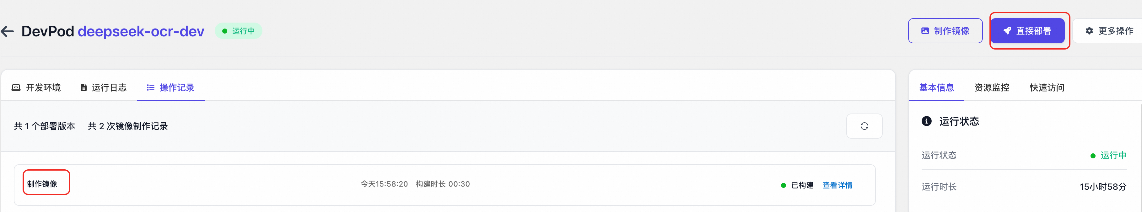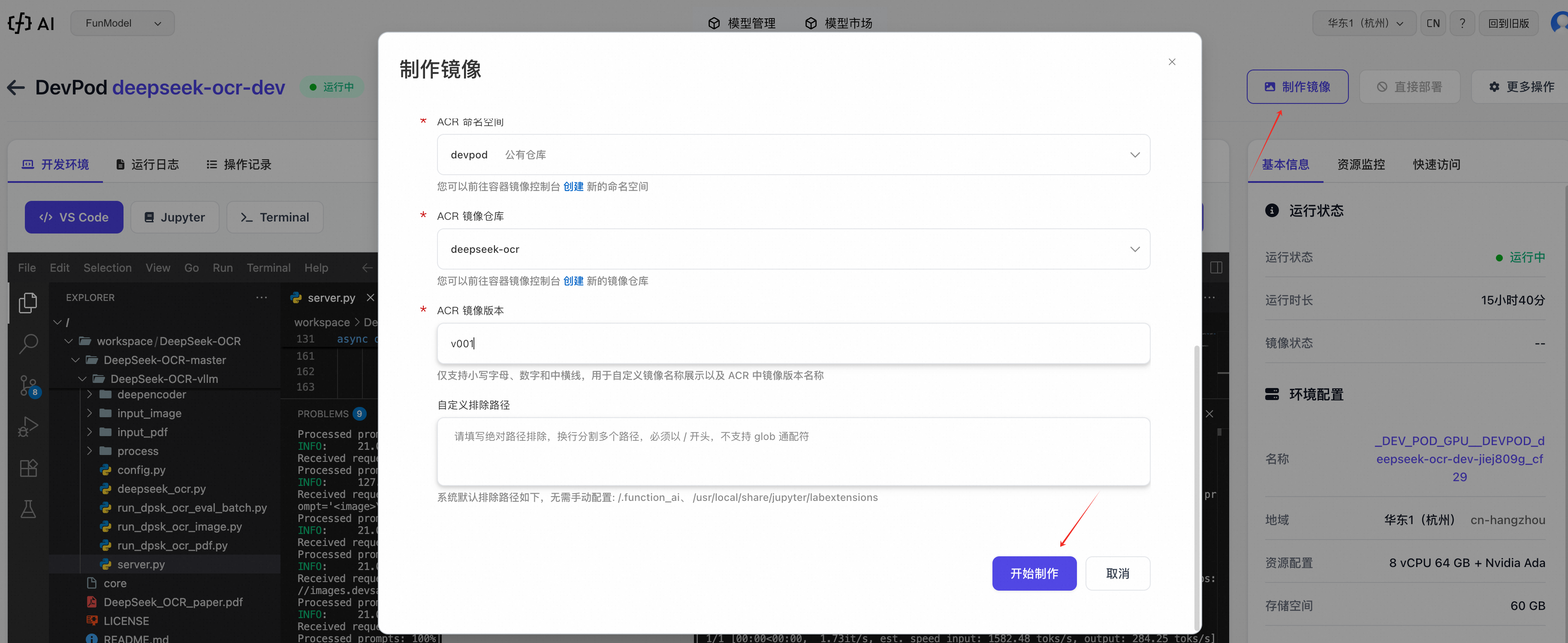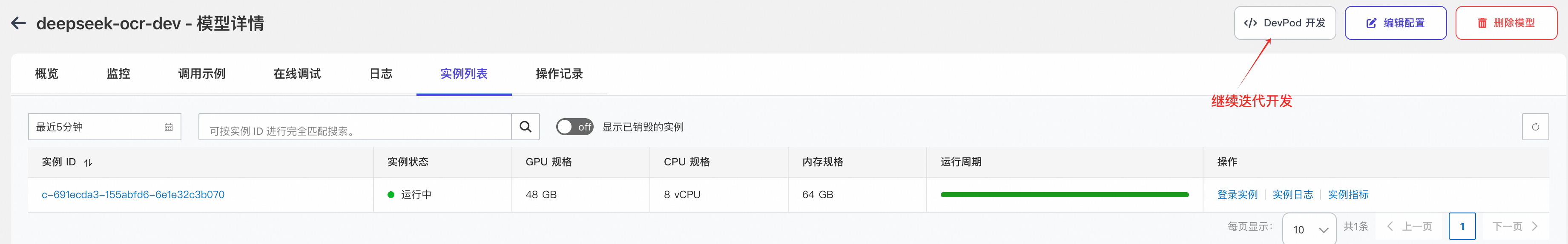 DevPod 通过统一的工作空间和无缝衔接的部署能力,打通了从代码到服务的最后一公里。下面,我们将通过 DeepSeek-OCR 模型的实战案例,完整演示这一工作流。