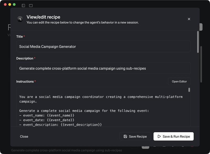 以下是协调三个平台特定子配方的社交媒体活动配方(Advent of AI 第 15 天)示例: