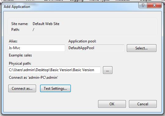 然后设置必填信息:别名,物理路径,应用池,用户认证信息,点击OK。
