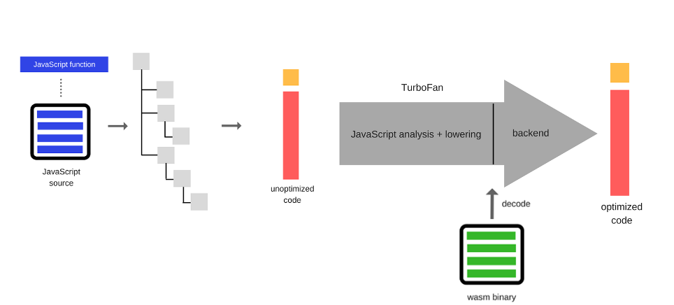 在汇编阶段,wasm已经优化过了。最重要的是,解析也不是必需的。你有一个优化的二进制文件,可以直接hook到可以生成机器码的后端。所有优化都由编译器在前端完成。 这使得执行wasm更有效率,因为流程中的很多步骤都可以简单地跳过。