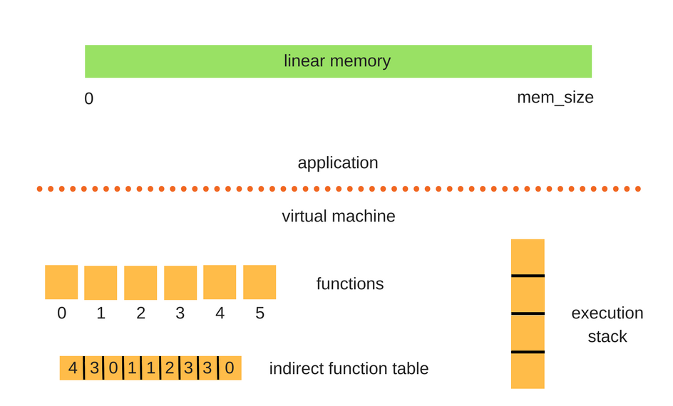 WebAssembly采用完全不同的模型。执行堆栈与WebAssembly程序本身是分开的,因此您无法在其中修改并更改变量等内容。而且,这些函数使用整数偏移而不是指针。函数指向一个间接函数表。然后这些直接计算的数字跳转到模块内部的函数中。它是以这种方式构建的,以便您可以同时加载多个wasm模块,形成多个索引列表,并且一切正常。 有关JavaScript中内存模型和管理的更多信息,可以查看关于该主题的非常详细的帖子。