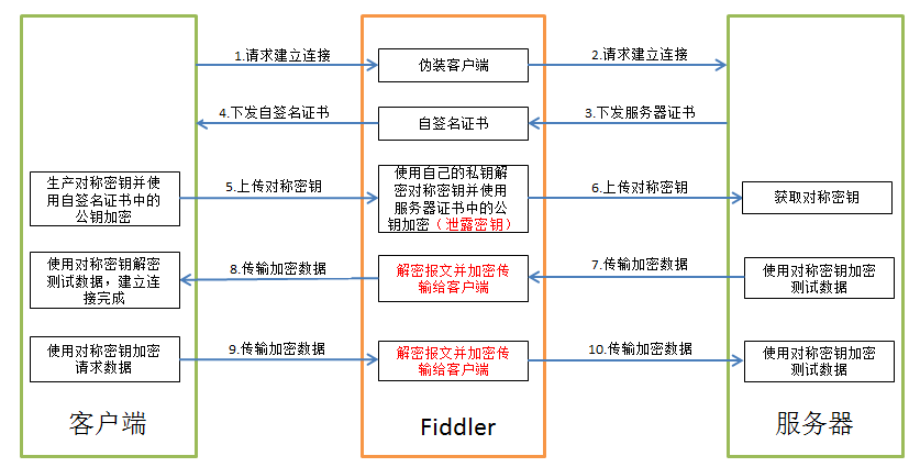 - Fiddler使用前面获取的对称密钥解密客户端发送的数据并重新加密转发给客户端。