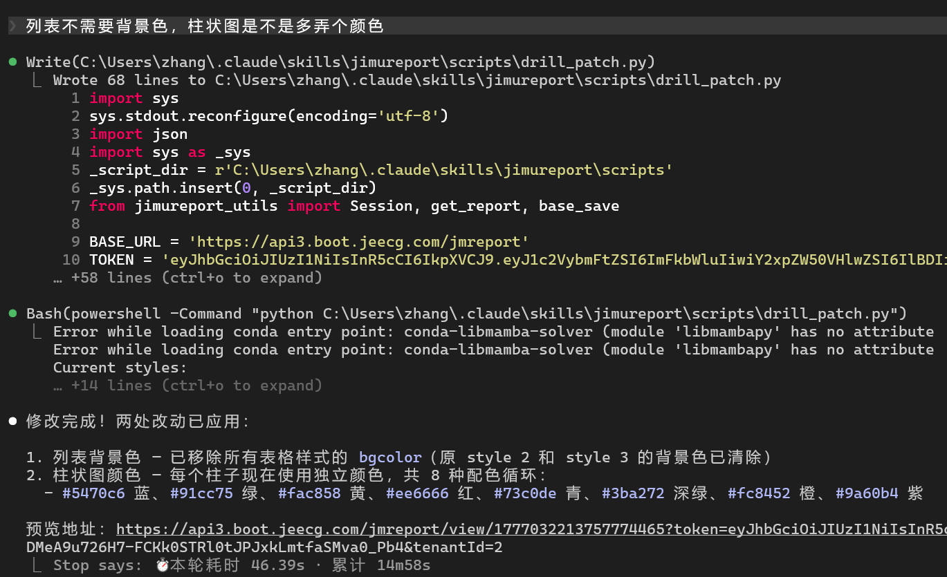 - 响应速度快:纯配置修改(如报表去颜色)比原生 Claude Code 还快,体感明显。
