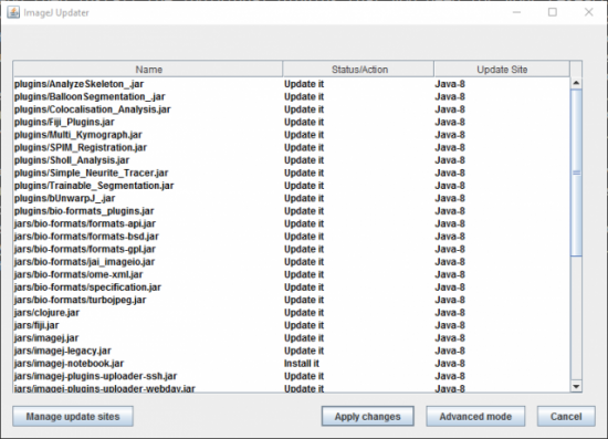 所有已安装的插件都在“插件”菜单项中可选。一旦你安装了很多插件,列表会变得冗杂,所以需要精简你选择的插件。你想手动更新的话,点击“Help”->“Update Fiji” 菜单项强制检测并获取可用更新的列表(图 3)。