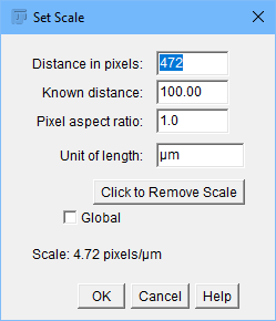 第一步给图片设定比例,这样你可以告诉 ImageJ 如何判别物品。首先,选择在工具栏选择线条按钮。然后选择“Analyze”->“Set Scale”,然后就会设置比例尺包含的像素点个数(图 5)。你可以设置“known distance ”为 100,单元为“um”。