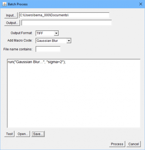 当你有一个分析程序可以工作于给定图片类型,你通常需要将相同的步骤应用到一系列图片当中。这可能数以千计,你当然不会想对每张图片手动重复操作。这时候,你可以集中必要步骤到宏,这样它们可以被应用多次。点击插件->“Macros”->“Record”,弹出一个新的窗口记录你随后的所有命令。所有步骤完成,你可以将之保存为一个宏文件,并且通过点击“Plugins”->“Macros”->“Run”来在其它图片上重复运行。