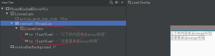 <?xml version="1.0" encoding="utf-8"?><merge xmlns:android="http://schemas.android.com/apk/res/android"> <TextView android:id="@+id/tv" android:layout_width="wrap_content" android:layout_height="wrap_content" android:text="这里是来自merge布局" /></merge>