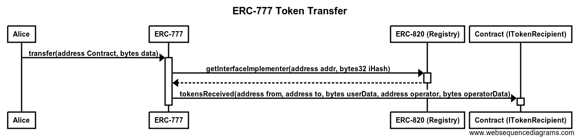 另外,ERC-777 使用了新标准 ERC-820:使用一个注册合约的伪内省,它允许为合约注册元数据以提供一个简单的内省类型。并考虑到了向后兼容和其它的功能扩展,这些取决于由一个 EIP-820 查找到的地址返回的 ITokenRecipient,和由目标合约实现的函数。