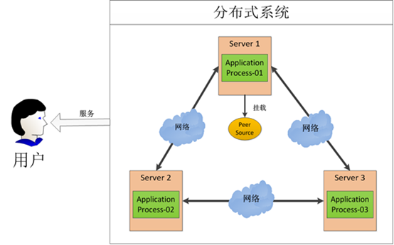 图中有三台机器,每台机器各跑一个应用程序。将这三台机器通过网络将其连接起来,构成一个系统来为用户提供服务,对用户来说这个系统的架构是透明的,他感觉不到我这个系统是一个什么样的架构。我们可以把这种系统称作一个分布式系统。
