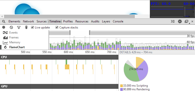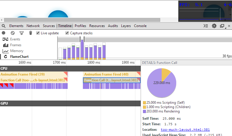 rAF(update);DEMO版本之所以慢的原因是,在修改每一个物体的left值时,会请求这个物体的offsetTop值。这是一个非常耗时的reflow操作(具体还有哪些耗时的reflow操作可以参考这篇: How (not) to trigger a layout in WebKit)。这一点从Chrome调试工具中可以看出来(截图中的某些功能需要在Chrome canary版本中才可启用)