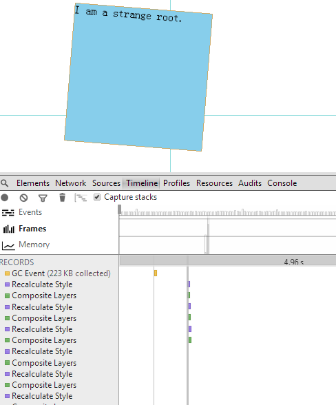 <div id="foo">I am a strange root.</div></body></html>运行时的timeline截图如下: