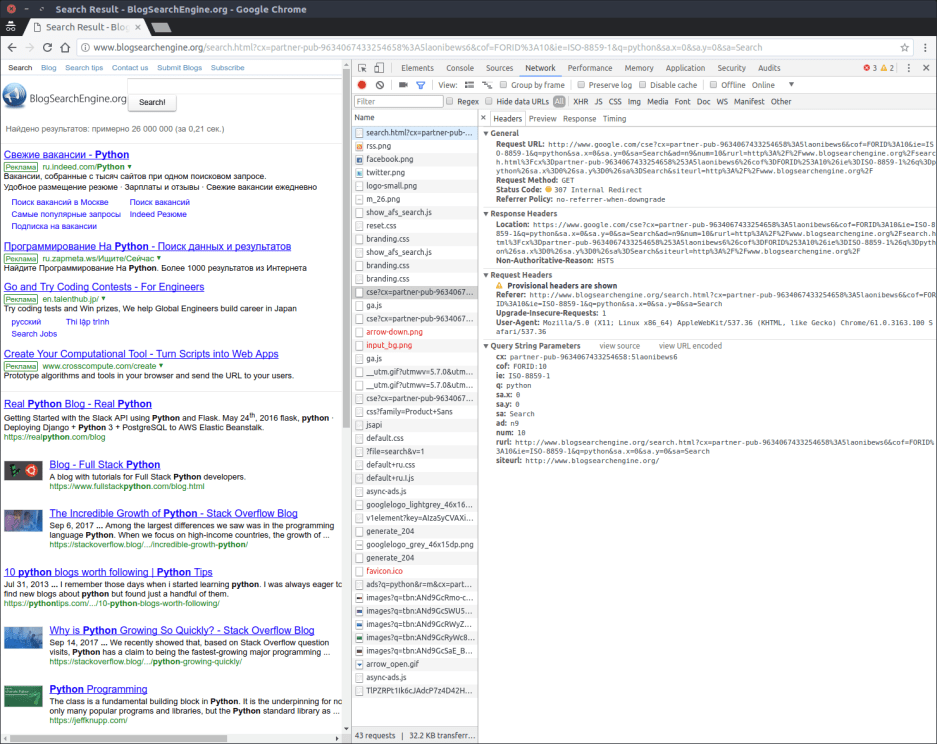 所以,我们要做的是到 www.blogsearchengine.org 网站,搜索 “python”,并在一侧打开 Chrome 开发者工具中的网络标签页。这截图是我们将要看到的: