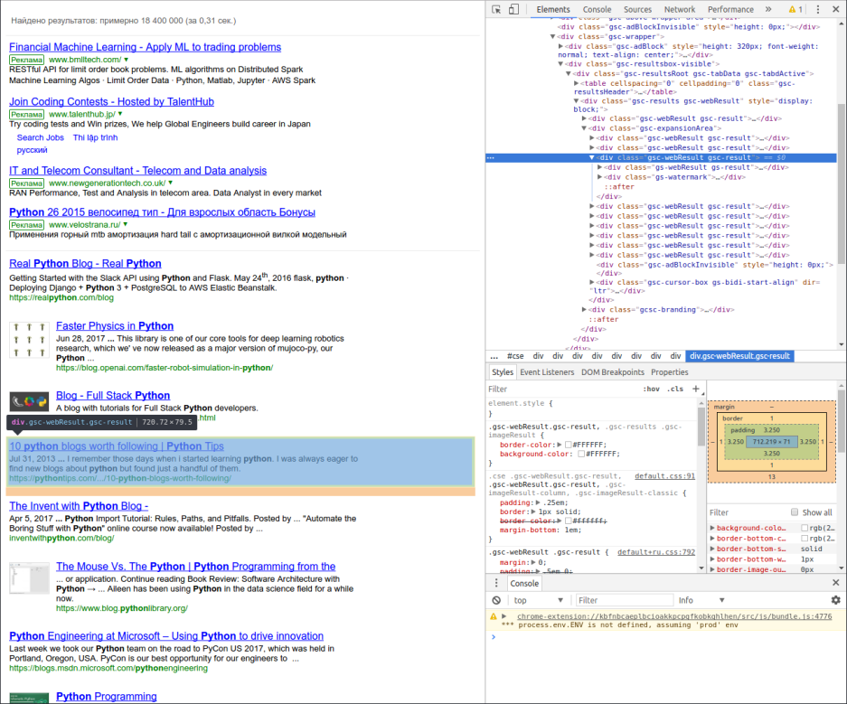 第一步显然是获取数据。我们需要关于编程博客的谷歌搜索结果。你看,如果我们开始仅仅用谷歌自己来搜索,比如说查询 “Python”,除了博客,我们还会得到很多其它的东西。我们需要的是做一些过滤,只留下特定的博客。幸运的是,有一种叫做 Google 自定义搜索引擎(CSE)的东西,它能做到这一点。还有一个网站 www.blogsearchengine.org,它正好可以满足我们需要,它会将用户请求委托给 CSE,这样我们就可以查看它的查询并重复利用它们。