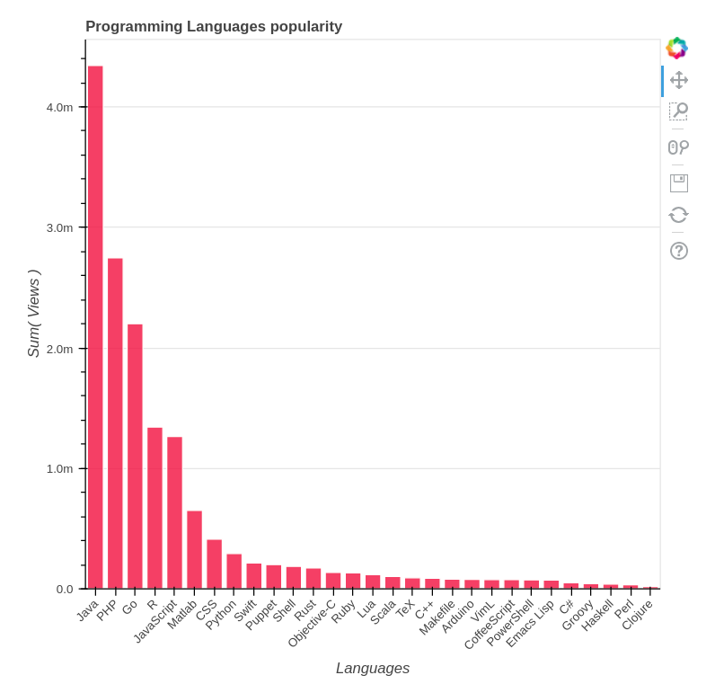 result['views'] = views return result在这里,我们首先按语言(词典中的关键字“query”)来分组我们的数据,然后使用 python 的 groupby 函数,这是一个从 SQL 中借来的奇妙函数,从我们的数据列表中生成一组条目,每个条目都表示一些编程语言。然后,在第 14 行我们计算每一种语言的总页面浏览量,然后添加 ('Language', rank) 形式的元组到 popularity 列表中。在循环之后,我们根据总浏览量对流行度数据进行排序,并将这些元组展开到两个单独的列表中,然后在 result 变量中返回它们。