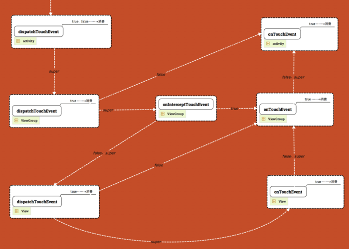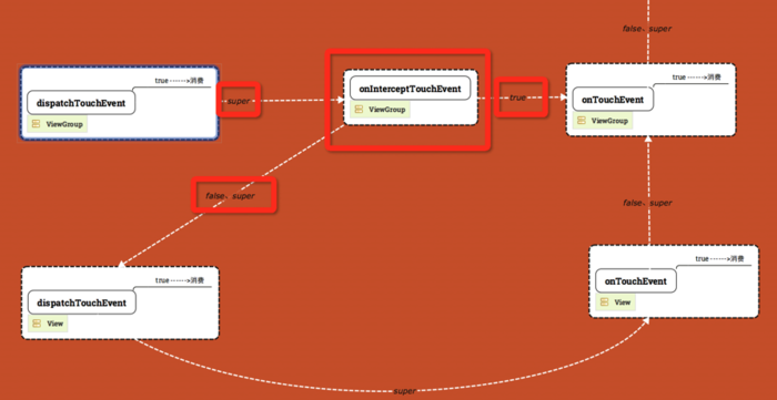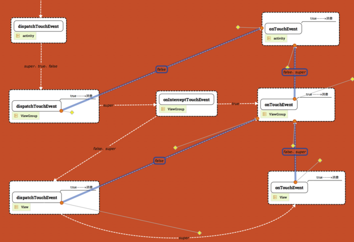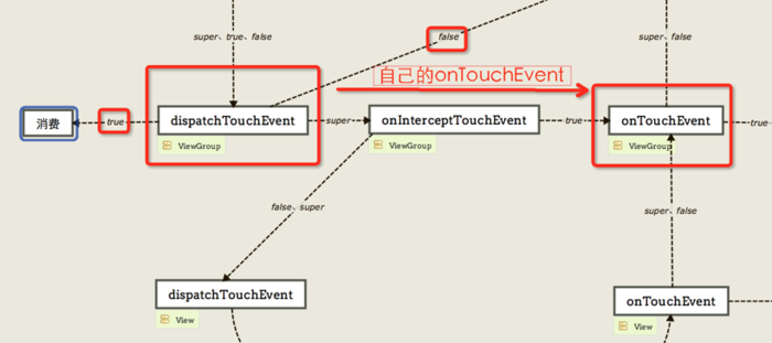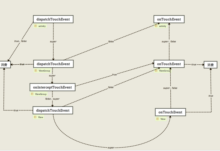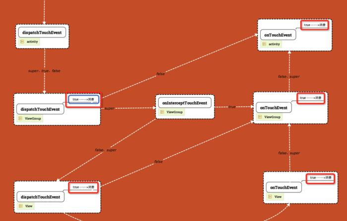 dispatchTouchEvent和 onTouchEvent的框里有个【true---->消费】的字,表示的意思是如果方法返回true,那么代表事件就此消费,不会继续往别的地方传了,事件终止。