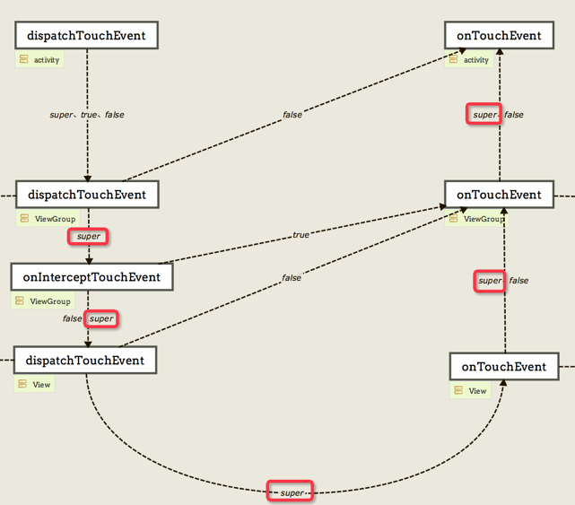 ViewGroup 和View的这些方法的默认实现就是会让整个事件安装U型完整走完,所以 return super.xxxxxx() 就会让事件依照U型的方向的完整走完整个事件流动路径),中间不做任何改动,不回溯、不终止,每个环节都走到。