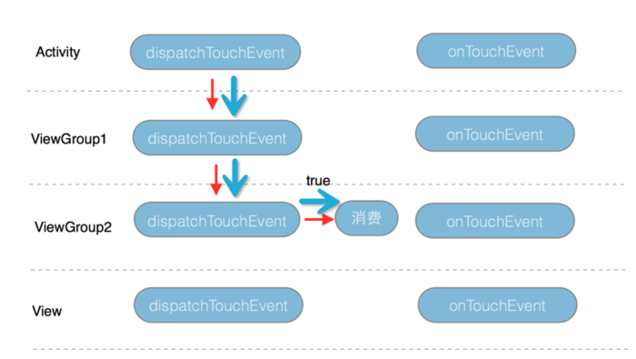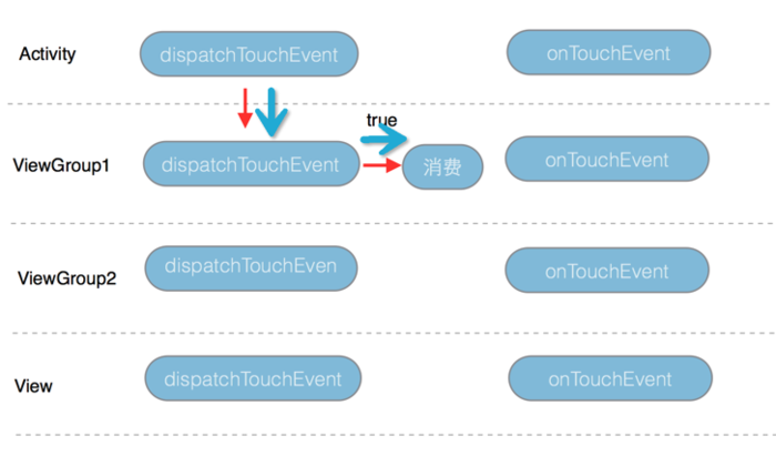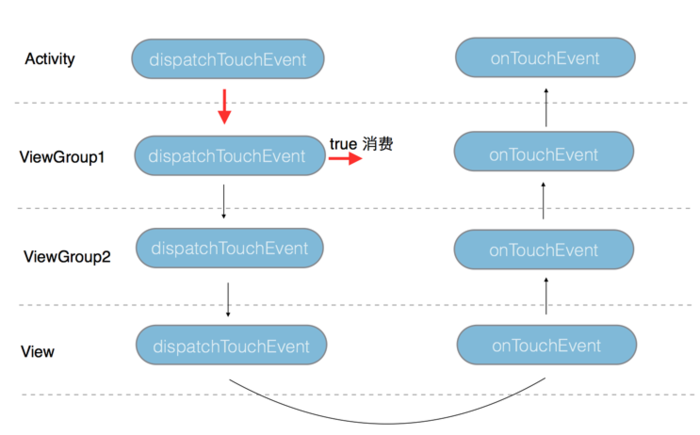 ACTION_DOWN 事件从(Activity的dispatchTouchEvent)--------> (ViewGroup1 的dispatchTouchEvent) 后结束传递,事件被消费(如下图红色的箭头代码ACTION_DOWN 事件的流向)。