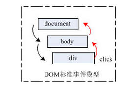 DOM2是标准化的事件,使用DOM2事件,事件传递首先从捕获方式开始即从document开始,再到body,div是一个中介点,事件到了中介点时候事件就处于目标阶段,事件进入目标阶段后事件就开始冒泡处理方式,最后事件在document上结束。(捕获事件的起点以及冒泡事件的终点,我本文都是指向document,实际情况是有些浏览器会从window开始捕获,window结束冒泡,不过我觉得开发时候不管浏览器本身怎么设定,我们关注document更具开发意义,所以我这里一律都是使用document)。人们习惯把目标阶段归为冒泡的一部分,这主要是因为开发里冒泡事件使用的更加广泛。