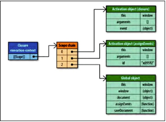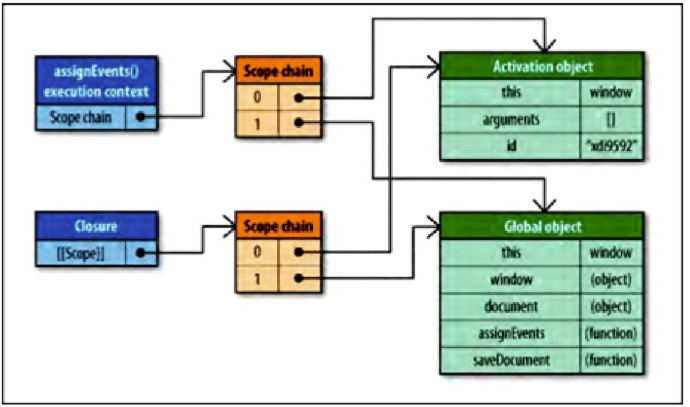 }assignEvents()函数为DOM元素指定了一个事件处理句柄。此事件处理是一个闭包,当函数执行创建时可以访问其范围内部的id变量。而这种方法封闭了对id变量的访问,必须创建一个特定的作用域链。