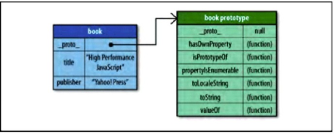 alert(book.toString()); //"[object Object]"此代码中book有title和publisher两个实例成员。注意它并没有定义toString()接口,但这个接口却被调用且没有抛出错误。toString()函数就是一个book继承自原型对象的原型成员。下图表示了它们的关系: