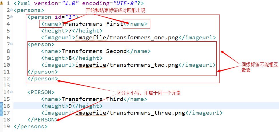 由于XML具有很强的扩展性,致使它需要很强的基础规则来支持扩展,所以在编写XML文件时,我们应该严格遵守XML的语法规则,一般XML语法有如下规则:(1)起始和结束的标签相匹配;(2)嵌套标签不能相互嵌套;(3)区分大小写。下面是给出了一个编写错误的XML文件以及对其的错误说明,如下: