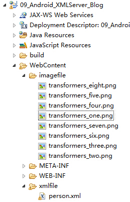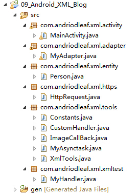 在Android开发中,较为常用的XML解析器有SAX解析器、DOM解析器和PULL解析器,下面我们将会一一学习如何使用这些XML解析器。那在介绍这几种XML解析器过程中,我们依然是要通过一个实例来学习它们的实际开发方法,下面是我们Demo实例的程序列表清单,如下: