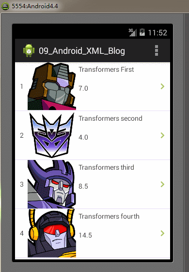 <?xml version="1.0" encoding="UTF-8"?> <persons> <person id="1"> <name>Transformers First</name> <height>7</height> <imageurl>imagefile/transformers_one.png</imageurl> </person> <person id="2"> <name>Transformers second</name> <height>4</height> <imageurl>imagefile/transformers_two.png</imageurl> </person> <person id="3"> <name>Transformers third</name> <height>8.5</height> <imageurl>imagefile/transformers_three.png</imageurl> </person> <person id="4"> <name>Transformers fourth</name> <height>14.5</height> <imageurl>imagefile/transformers_four.png</imageurl> </person> <person id="5"> <name>Transformers fifth</name> <height>27.5</height> <imageurl>imagefile/transformers_five.png</imageurl> </person> <person id="6"> <name>Transformers Sixth</name> <height>8.5</height> <imageurl>imagefile/transformers_six.png</imageurl> </person> <person id="7"> <name>Transformers Seventh</name> <height>5</height> <imageurl>imagefile/transformers_seven.png</imageurl> </person> <person id="8"> <name>Transformers Eighth</name> <height>12.5</height> <imageurl>imagefile/transformers_eight.png</imageurl> </person> </persons>